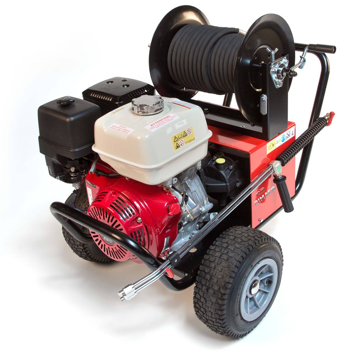 Caractéristiques Techniques :Pompe : radiale à vilebrequin, 3 pistons céramique[[CR]]Régulateur : séparé de la culasse avec retombée de pression à zéro[[CR]]Système injection produit : intégré[[CR]]Réducteur : réduit la vitesse de rotation de la pompe[[CR]]Moteur : essence avec sécurité manque d’huile[[CR]]Démarrage : lanceur[[CR]]Châssis et capot : acier mécano-soudé, peinture époxy[[CR]]Enrouleur : acier sur capot métal renforcé[[CR]]Flexible : 20 m 3/8 deux tresses métalliques[[CR]]Pistolet HP : avec raccord tournant (côté flexible)[[CR]]Lance double 900 mm : réglable haute et basse pression[[CR]]Lance turbo 700 mm : avec buse rotative OFFERTE[[CR]]Raccord à billes : en sortie de pompe[[CR]]Roues gonflables : Ø 500 mm[[CR]]Conditions d’utilisation : Intensif